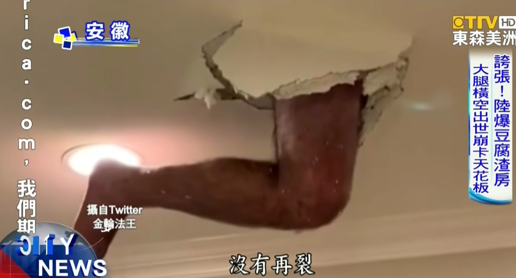 大陸安徽日前驚爆豆腐渣房子,樓上的住戶活動到一半,竟然不小心「踩破地板」,整條腿陷入洞裡,出現在樓下鄰居的天花板上,畫面猶如動畫裡的場景。