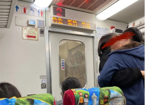 照片中可見,這對男女親密地抱在一起,分別將口罩拉到下巴,隨後忘情激吻,仿佛忘了現在是防疫敏感時期,而且周遭還有其他乘客。原PO目睹傻眼,將畫面拍下提醒「出門在外,請大家控制好自己的小頭,謝謝!」