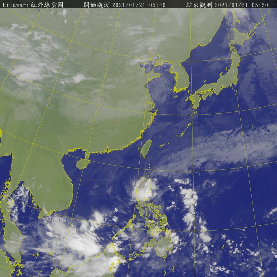 ▲今(21)日西半部晴時多雲,東半部多雲偶有局部短暫雨的機率。(圖/翻攝中央氣象局)