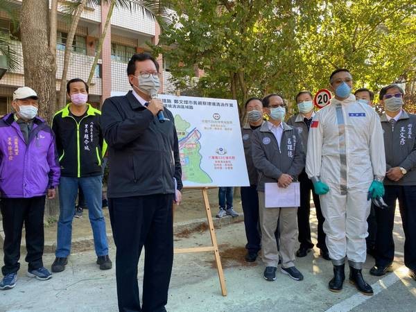 ▲鄭文燦視察桃園醫院附近社區環境清潔消毒。(圖/市府提供)
