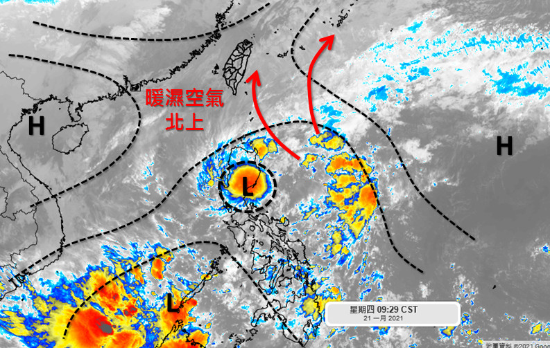 天氣職人吳聖宇則說,今年第一個熱帶擾動90W前兩天開始在菲律賓以東發展,並且往隨著整個東風波動向西趨向呂宋島,目前在呂宋島上空,有繼續進入南海並且逐漸消散的趨勢。雖然它發展不起來,但是外圍卻有許多暖濕空氣沿著太平洋高壓邊緣向北擴散,今天已經逐漸來到台灣以東海域及巴士海峽一帶。