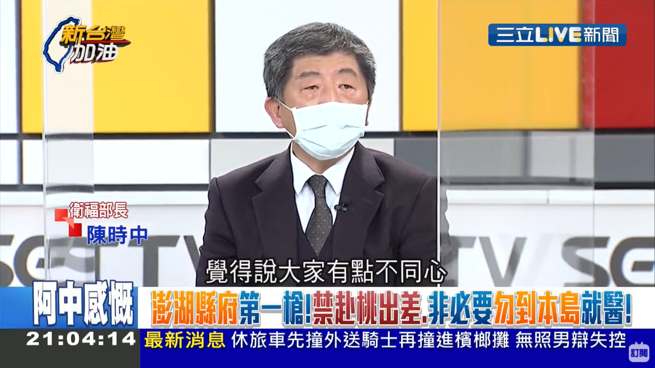陳時中上政論節目《新台灣加油》談到,大家會想避開風險區域很正常,但站在防疫整體角度來看,他難免覺得大家有點不同心,「我今天中午在記者會,我也同樣講說,當初桃園疫情很緊的時候,那時候離島居民要回去,離島希望居民先在本島把居家檢疫做完,桃園第一個伸出援手,歡迎大家居家檢疫。」