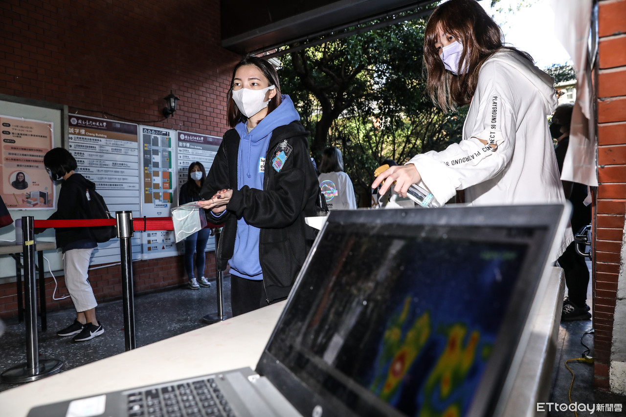 ▲110年大學學測,考生手部消毒量體溫進考場。(圖/記者林敬旻攝)