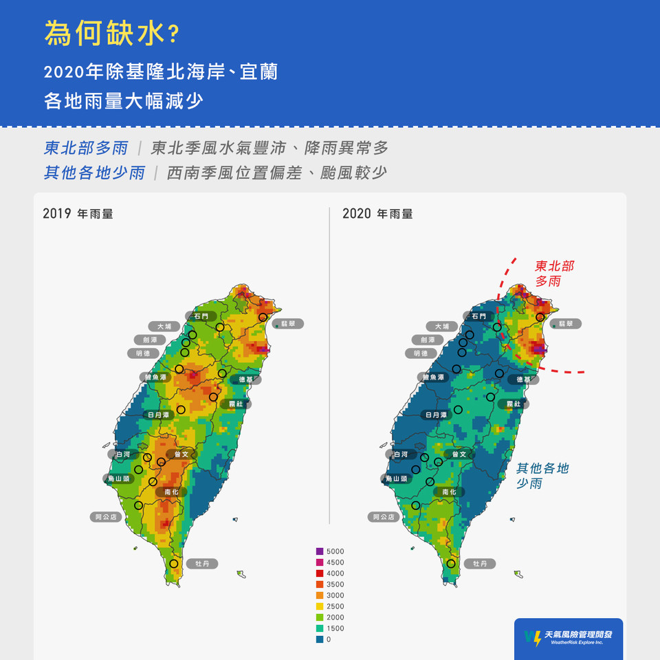 他接著指出,「2020年的降雨和2019年比較起來,有『普遍減少、更為集中』的趨勢」,像是在基隆北海岸到宜蘭一帶,從去年9月開始,受到東北季風挾帶豐沛的水氣影響,每天都是陰雨不斷,造成雨量明顯偏多的現象。但看看其他地區,尤其缺水的桃竹苗、中南部,雨量則明顯減少許多。