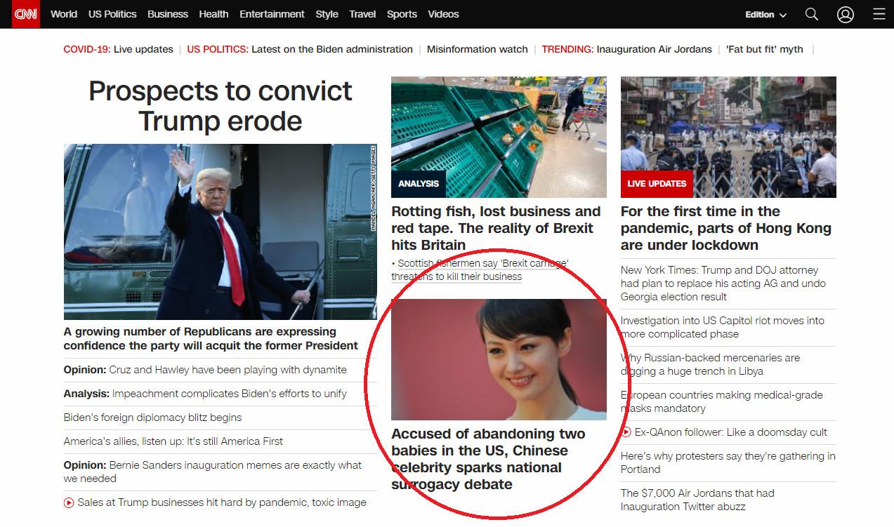 中國大陸女星鄭爽爆出代孕棄子醜聞,除了引來社會輿論批評之外,也接連遭到央視、新華社、廣電總局點名封殺。而這整件醜聞也登上美國媒體CNN首頁,報導中指出,儘管鄭爽尋找代理孕母的行為在「技術上」來說並無違法,但也葬送了自己的演藝生涯。