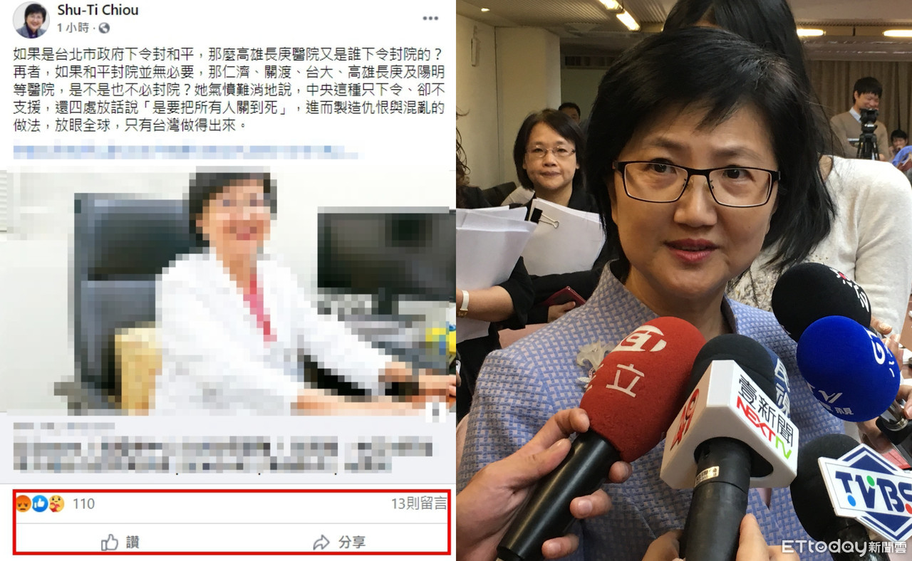 其實,邱淑媞稍早前,在臉書「Shu-Ti Chiou」分享一則她個人的專訪,其內容提到當年封院是中央和北市共同決議。另外,她也寫道,「如果是台北市政府下令封和平醫院,那麼高雄長庚醫院又是誰下令封院的?再者,如果和平封院並無必要,那仁濟、關渡、台大、高雄長庚及陽明等醫院,是不是也不必封院?」