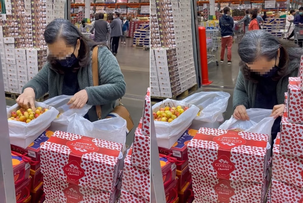 到賣場買東西最怕遇到翻來翻去的「挑貨大隊」,尤其是每盒產品都打開來檢查,在翻找、觸摸的過程不僅造成食物損傷,還會沾滿手部細菌。一名女子日前逛好市多(Costco)意外見到誇張一幕,一名灰衣大嬸站在櫻桃區,一次拆開3盒不停翻攪、還用手下去攪拌觸摸,其他客人看完都不敢買了。