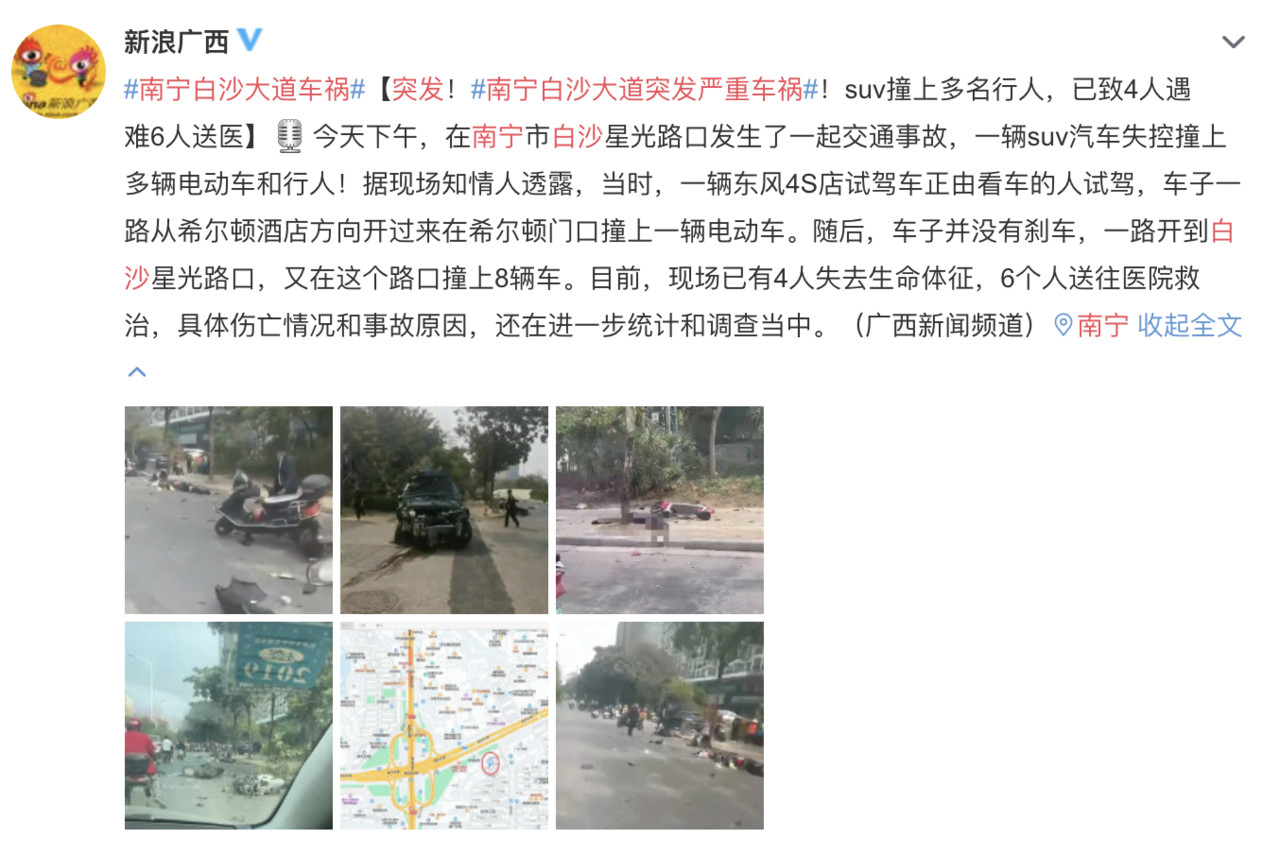 大陸廣西壯族自治區省會南寧市今(24日)下午發生一起重大車禍,一名汽車廠員工在駕車時,疑似操作不當,在道路上先後撞擊9輛電動自行車,造成4人死亡,6人受傷。
