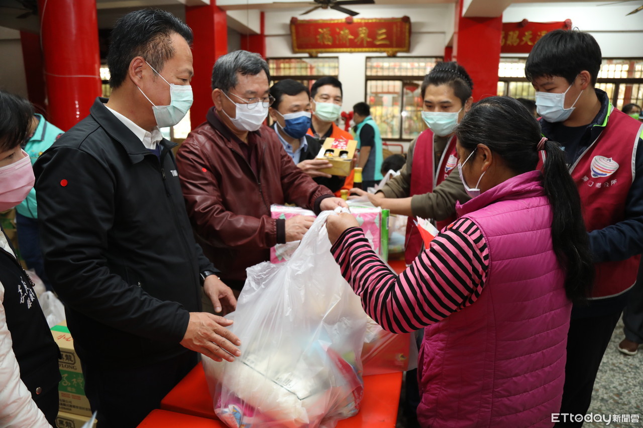 ▲縣長翁章梁、立委陳明文共同為溪口鄉公所、天臺殿發放物資給需要民眾 。(圖/記者翁伊森翻攝)
