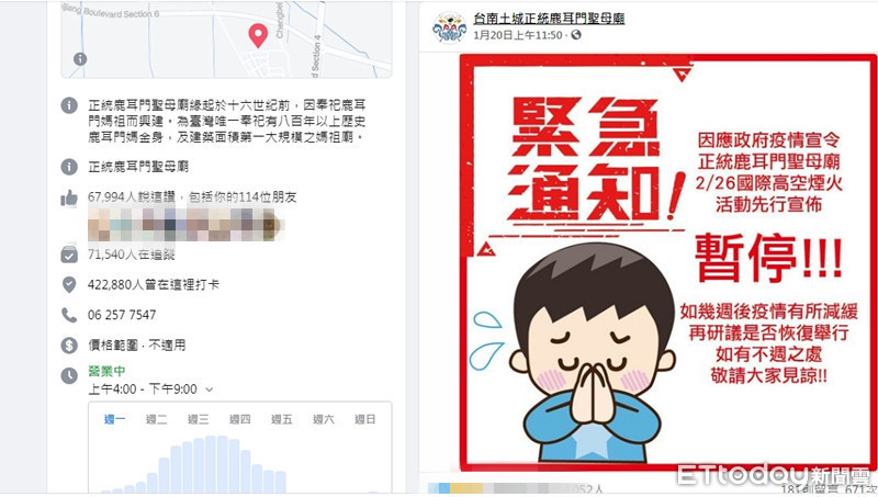 ▲配合政府防疫政策,繼市府宣布暫時取消今年鹽水蜂炮活動後,台南市土城聖母廟等多家廟宇自也陸續宣布取消近期大型遶境或春節期間重要活動。(圖/記者林悅翻攝)