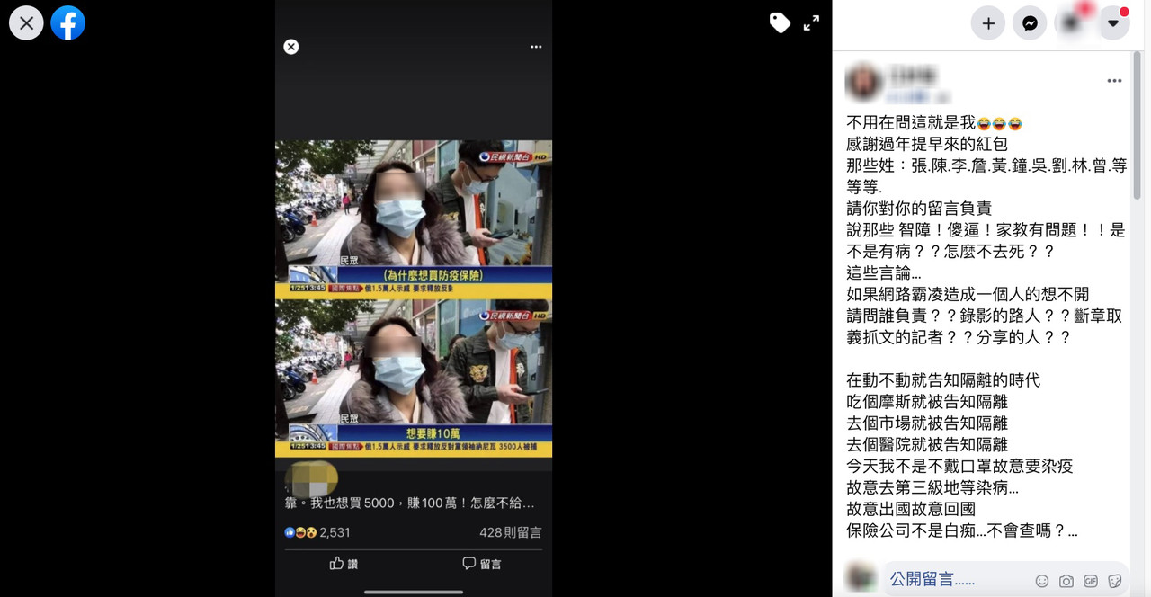 台灣產物保險推出的「500元防疫神單」因部桃新冠疫情升溫,受到廣大民眾爭相投保,一位妹子日前受到記者訪問,她的回應也被廣大鄉民製成梗圖瘋傳,她今(26)日就在臉書表示,「感謝過年提早來的紅包」,嗆網友要對那些不禮貌的留言負責。