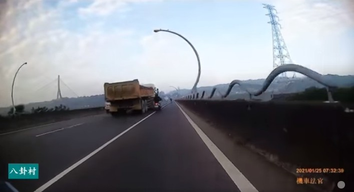 透過畫面可以看到,一輛機車行駛在里嶺大橋大橋上,而後方緊追著的是一輛砂石車,但沒想到,砂石車駕駛並未減速慢行,或是變換車道,反而緊貼著機車高速超車,嚇得機車騎士大抖了一下,還險些重心不穩,所幸騎士奮力找回重心,才沒倒地,否則後果不堪設想。