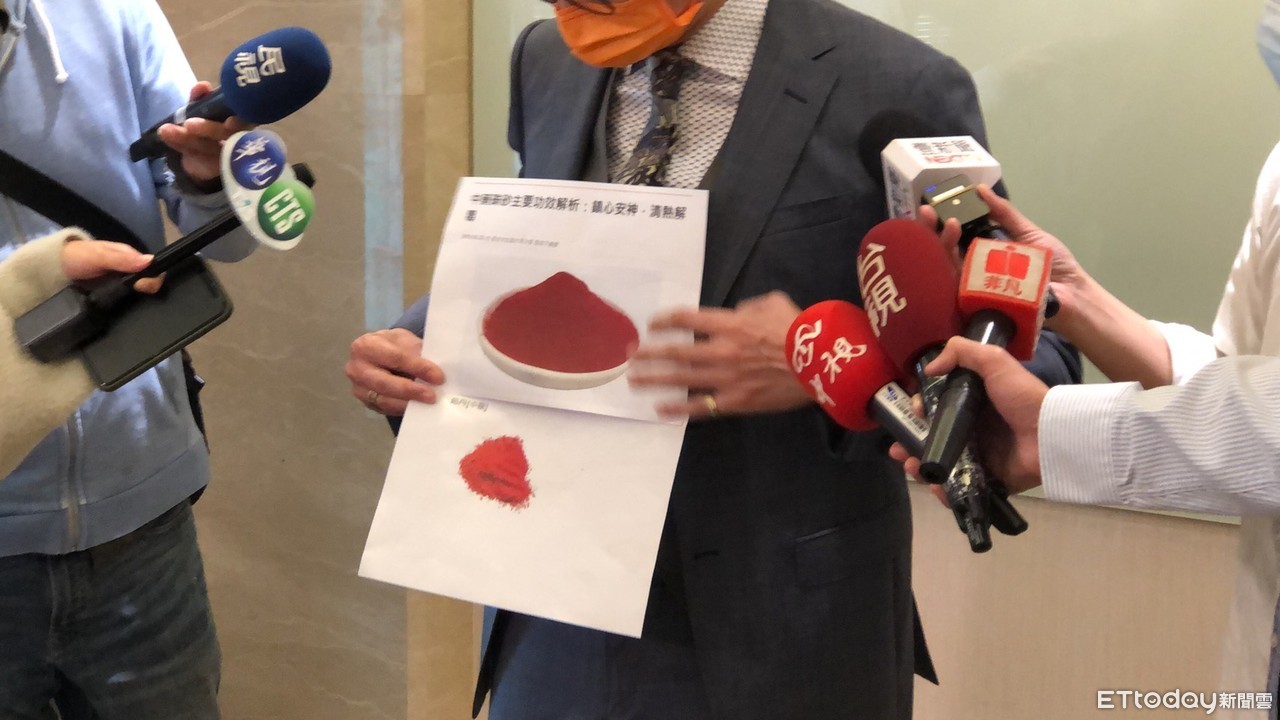 ▲李岳洋律師拿出「鉛丹」與「水飛硃砂」的對照圖,表示專長內科的呂醫師,一時也難以分辨。(圖/記者羅志華攝)