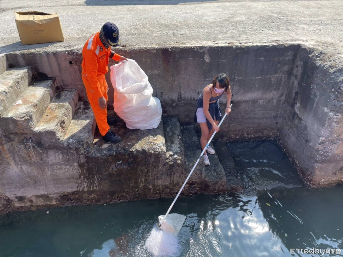▲台東長濱港受到柴油污染,海巡人員投置吸油棉等清除,避免海域生態遭破壞。(圖/第一三岸巡隊提供,下同)
