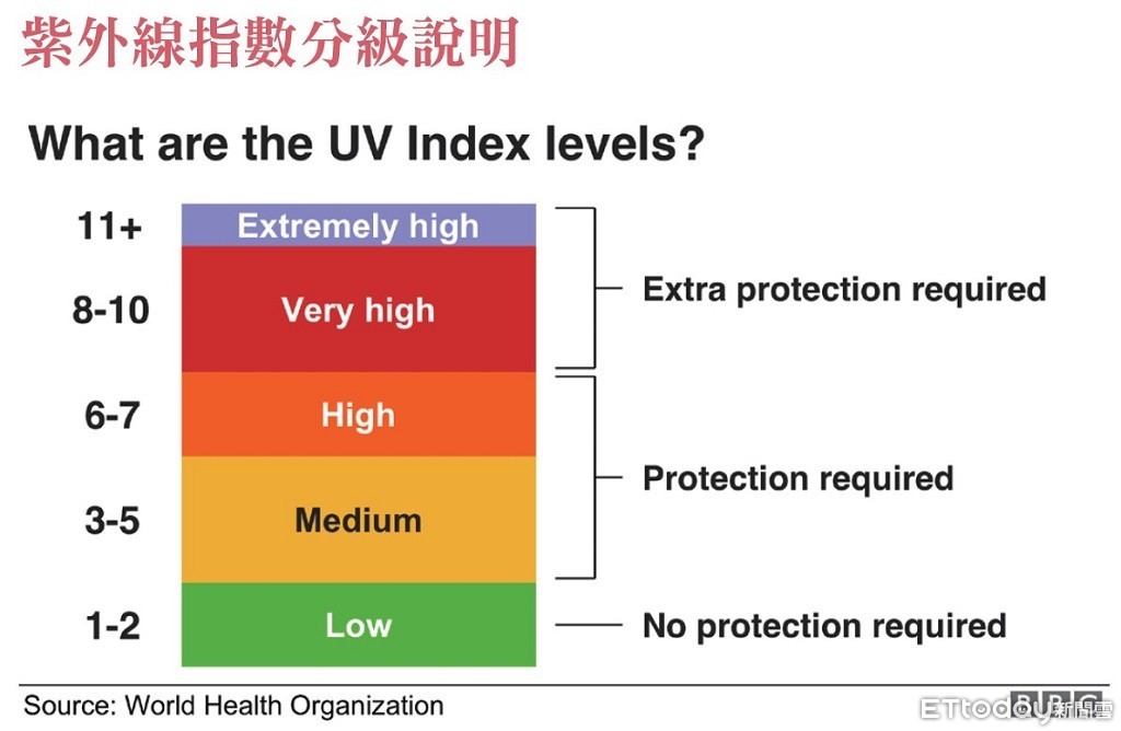 上圖是紫外線指數分級說明,世界衛生組織將紫外線指數(UV Index levels)從0到10進行分級,等級愈高,紫外線輻射更強。紫外線超強時還會超過10級,達到11+以上。因此,我們應該隨時注意紫外線預報,採取必要的保護措施。