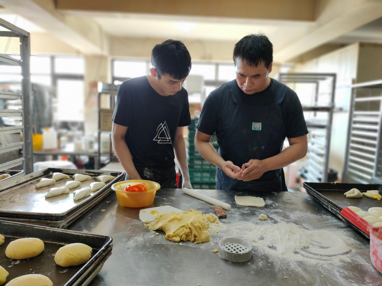 ▲阿林認真學習主廚教的新手法,麵包捏的漂亮才賣的出去。
