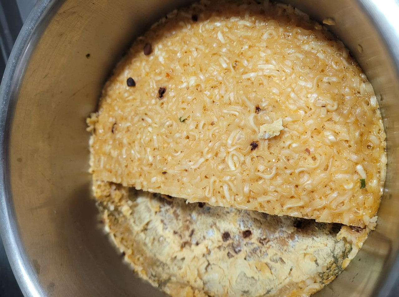 原PO在臉書社團「爆廢公社」分享公公做的「黑暗料理」,照片中可見,大量麵條出現在蒸蛋內,呈現出如同稻穗般的金黃色澤,但鍋內份量已被挖去三分之一,在鍋壁上留下清晰可見的蒸蛋痕跡。