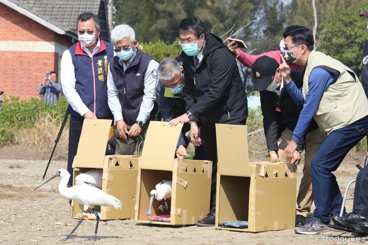 ▲台南市長黃偉哲等人,一同野放3隻傷癒黑面琵鷺。(圖/記者林悅翻攝,下同)