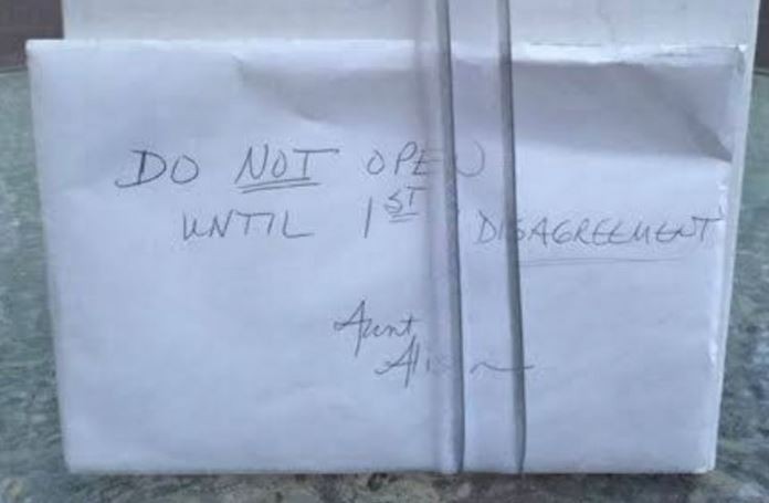 凱西表示,因為姑婆和姑丈公已結婚半世紀仍十分恩愛,夫妻倆一直以為禮物內容是「搶救婚姻」的關鍵,他們決定在9年後打開盒子一探究竟,這才發現盒內並沒有什麼搶救婚姻的妙招,而是放了2個信封,分別致信給夫妻倆。