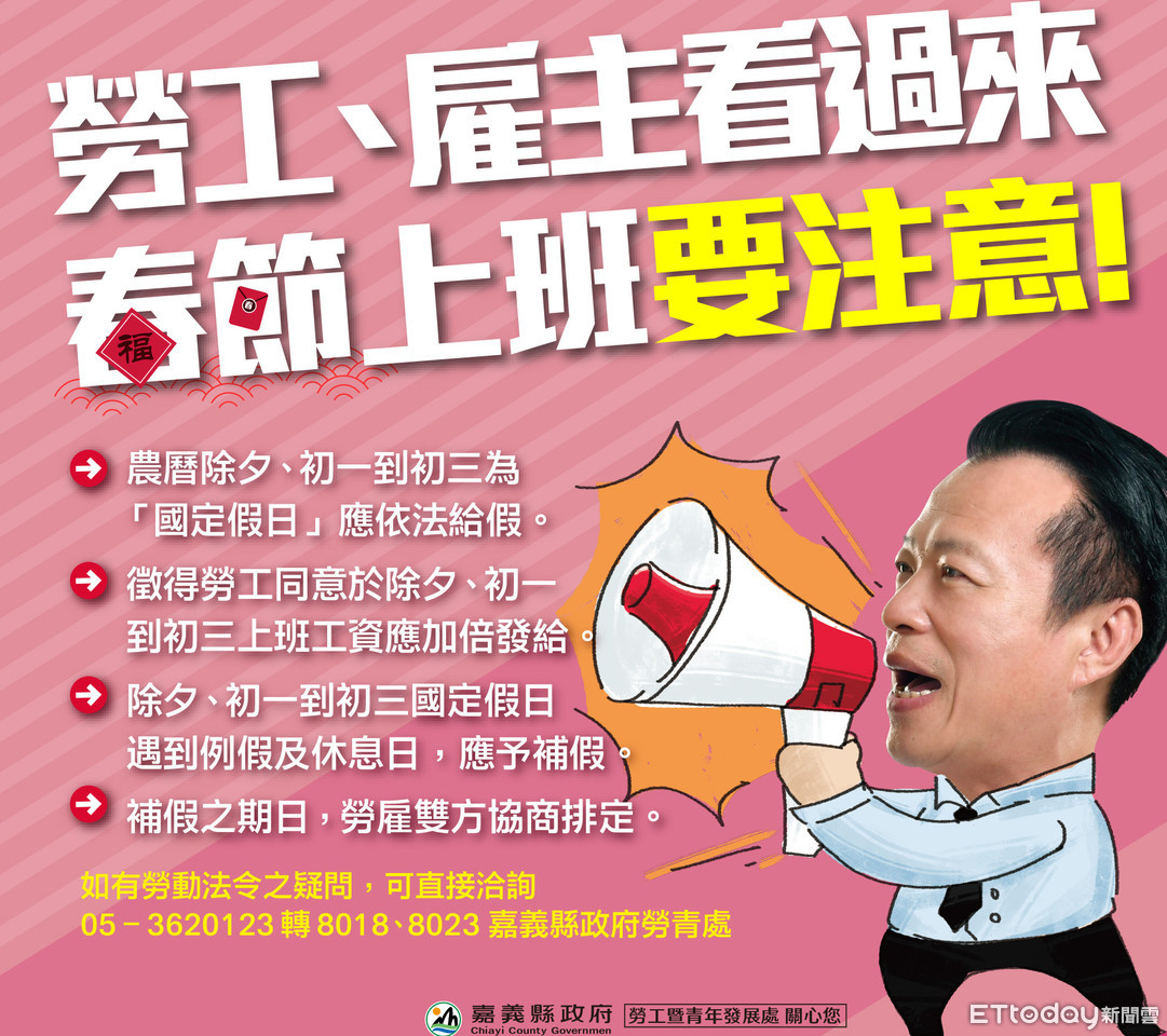 勞青處強調,今年將針對春節期間企業易違反情事,如國定假日工資、基本工資等加強輔導,如有勞動法令疑慮,請洽詢05–3620123轉8018、8023 嘉義縣政府勞青處。