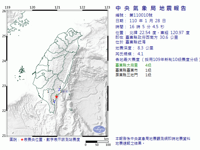 地震深度8公里,各地最大震度台東4級、屏東2級、嘉義2級、高雄1級、台南1級、雲林1級、南投1級、彰化1級。