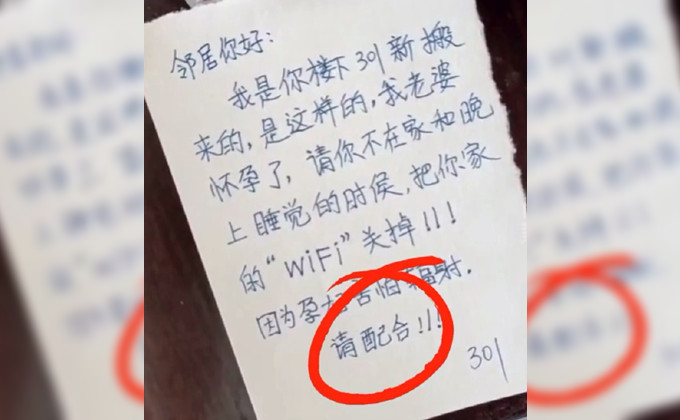 綜合陸媒報導,這位鄰居將紙條貼在女子家門上,內容寫道「我是你樓下301新搬來的,是這樣的,我老婆懷孕了,請你不在家和晚上睡覺的時候,把你家的WiFi關掉!!!因為孕婦害怕輻射,請配合!!!」