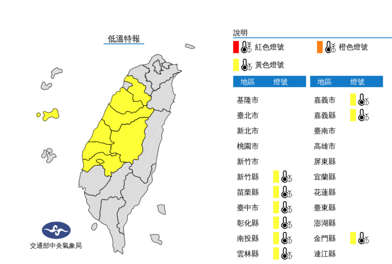 受到強烈大陸冷氣團影響,今日各地氣溫較冷,氣象局針對9縣市發布低溫特報,氣象局表示,今(29日)晚至明(30日)晨大陸冷氣團及輻射冷卻影響,北部及東北部天氣偏冷,其他地區早晚亦冷,易有10度以下氣溫發生;今晚至明晨局部地區有10度以下氣溫(黃色燈號)發生的機率。