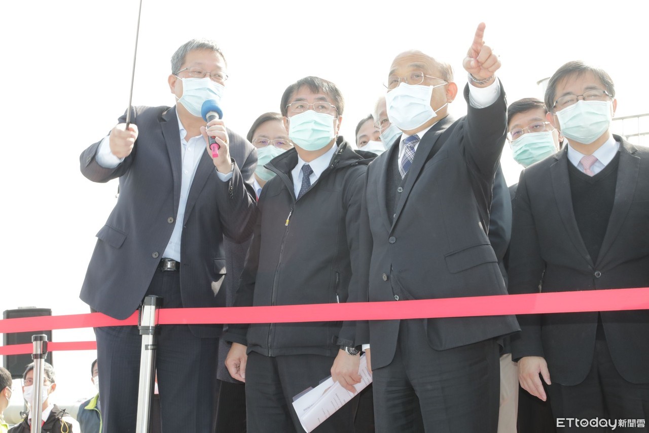 ▲行政院長蘇貞昌在台南市長黃偉哲等人陪同下,視察台南歸仁區的沙崙智慧綠能科學城各項建設工程成果,並聽取簡報。(圖/記者林悅翻攝,下同)