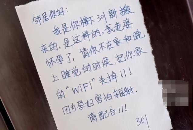 紙條是樓下鄰居貼的,因為他的妻子懷孕了,擔心輻射影響胎兒,便要求鄰居不在家的時候,和晚上睡覺的時候把WiFi關閉,並「請鄰居配合」。