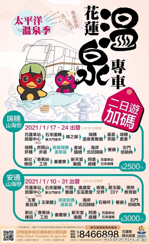 「太平洋溫泉季 花蓮溫泉專車」廣受好評,尤其是溫泉二日遊行程,相當受到遊客歡迎,花蓮縣政府順應民意和花蓮觀光協會合作,於今年年初再加碼四個梯次的二日遊行程!最後一梯次在1月31日及2月1日舉辦,歡迎民眾把握最後機會報名參加,到花蓮溫泉區住宿、享受暖呼呼的溫泉,對抗寒流!