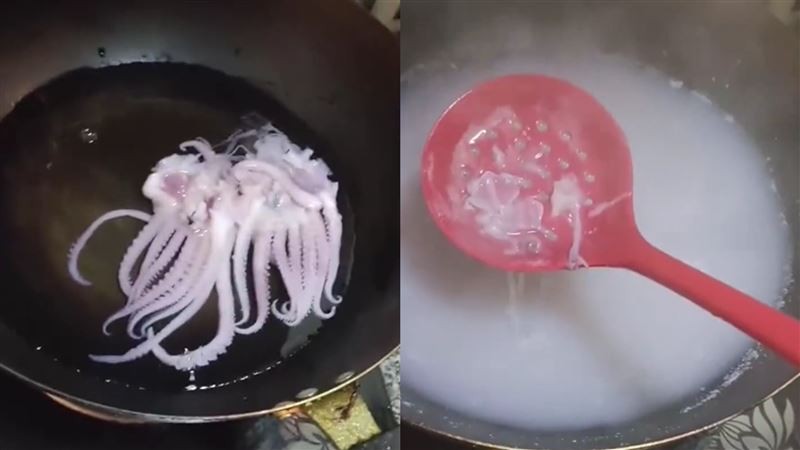 從女子上傳的影片中可以發現,她將大約兩斤的魷魚放入了鍋子中烹煮,並拿出了定時器計時,才經過5分多鐘,魷魚就開始消失,鍋中的水則變成了白色,表面漂浮著許多泡沫,到了約8分鐘時,鍋中的水變成了粉紅色,魷魚已完全不見。