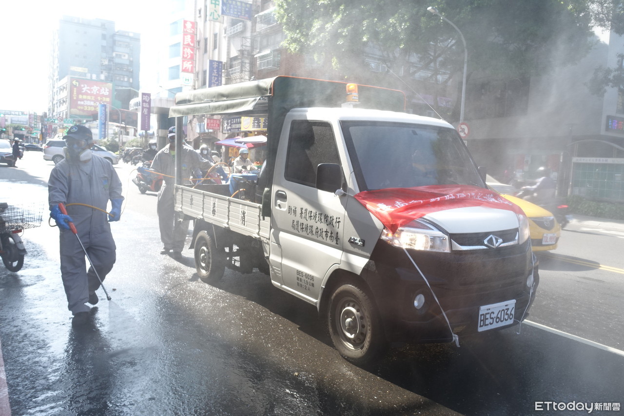 ▲台南市環保局出動砲霧消毒車、消毒車各一輛與8名消毒人員,與桃園市政府環保局人員併肩防疫,一起進行戶外環境消毒。(圖/記者林悅翻攝,下同)