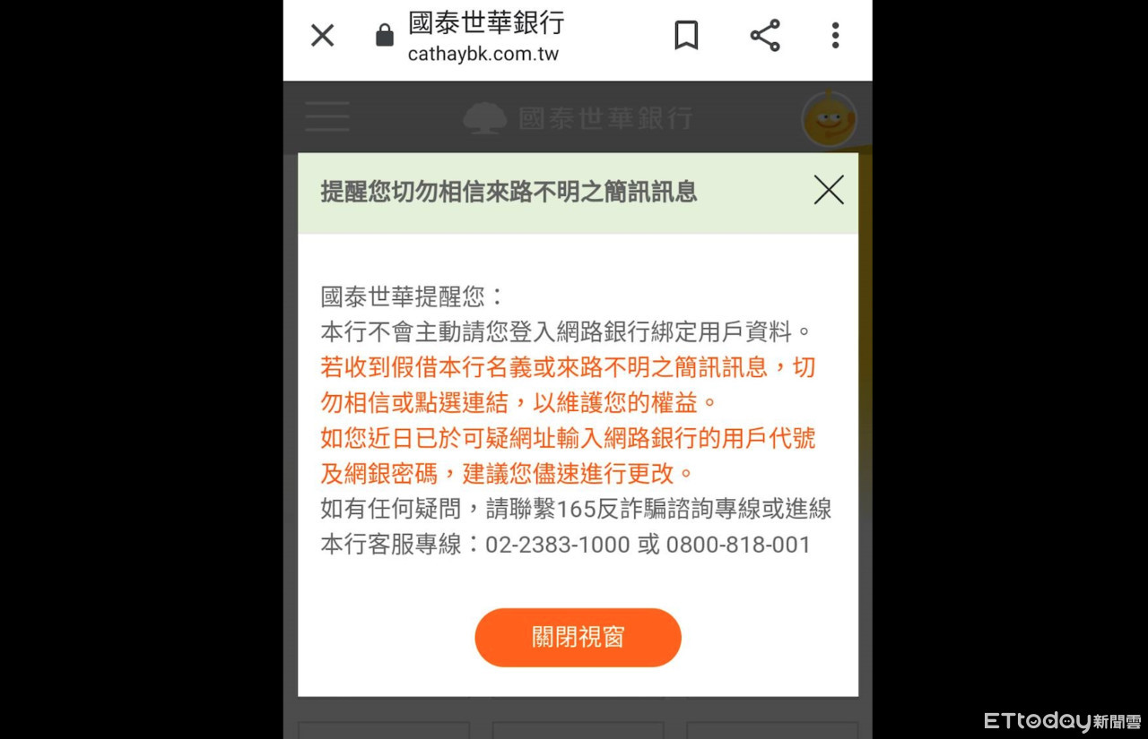 儘管國泰世華銀行在官方網站以及網銀APP上宣導相關訊息,但仍呼籲該銀行客戶盡速向金融機構查詢,以確認您的帳戶是否發生異常交易情形,儘速至鄰近機關報案。