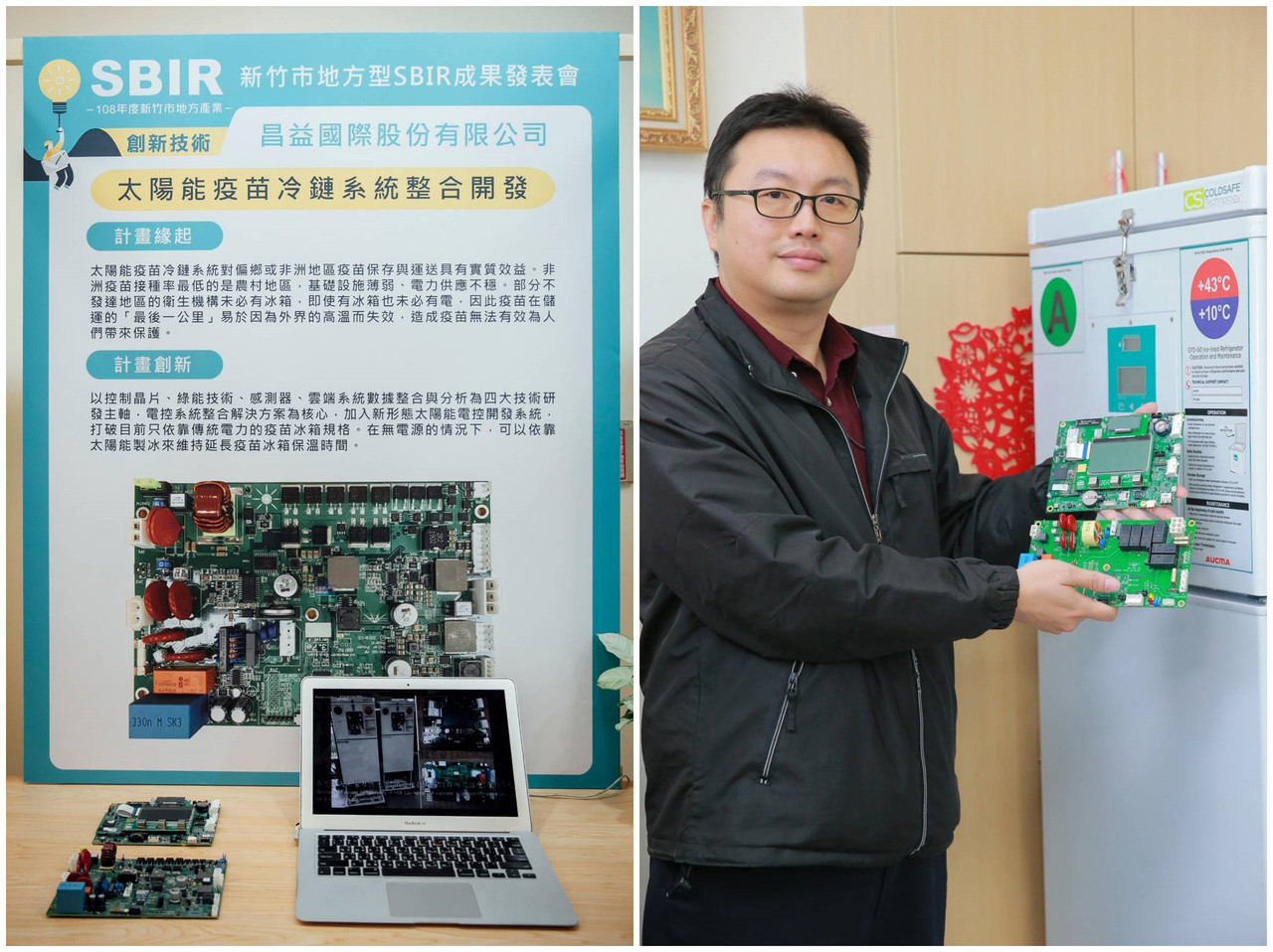 產業發展處張力可處長表示,全球偏鄉地區疫苗接種率的進一步提升迫在眉睫,昌益國際申請SBIR(地方型創新研發補助),獲得88萬,加入新型態太陽能電控開發系統,打破目前只依靠傳統電力的疫苗冰箱規格,在無電源的情況下,可以依靠太陽能製冰來維持延長疫苗恆溫2~8度C的低溫及保存時間。