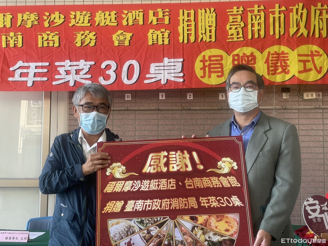 ▲福爾摩沙遊艇酒店台南商務會館董事長謝文祥,在過年前夕準備30桌份量的桌菜為消防弟兄加油打氣,由消防局副局長楊宗林(右)代表受贈。(圖/記者林悅翻攝,下同)