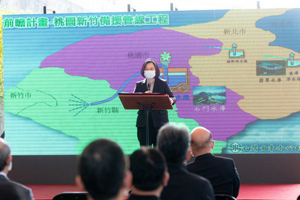 總統蔡英文1日由行政院長蘇貞昌、桃園市長鄭文燦、新竹市長林智堅等相關人士陪同,抵桃園平鎮給水廠,視察桃園新竹備援管線工程通水表示,桃園新竹備援管線工程原定今年3月才能完工,考量國內水情嚴峻,在蘇院長協調經濟部台水公司團隊全力施工下,克服天候及複雜工程困難,終於提前完工。