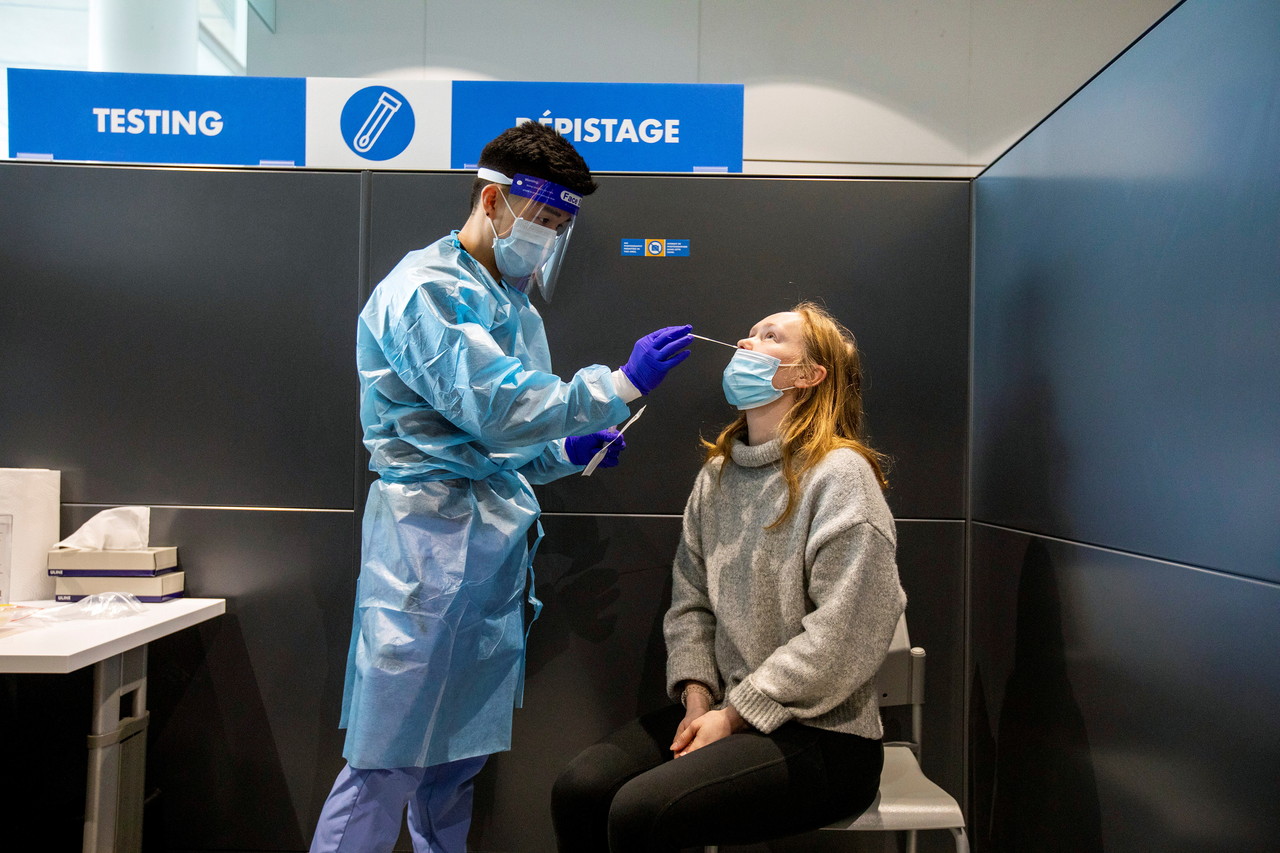 ▲機場一名病毒篩檢員在幫旅客進行檢測。(圖/路透)
