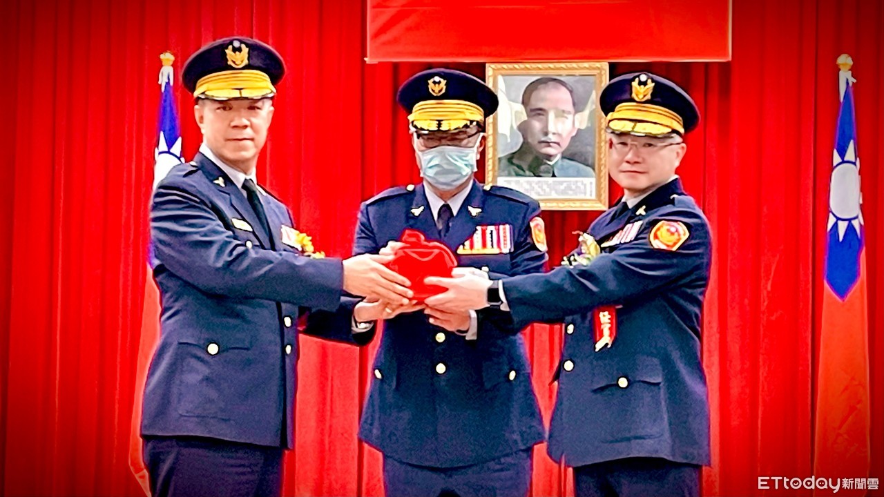 ▲海山分局長交棒李忠萍,新北警長黃宗仁:捍衛執法尊嚴不容打折。新北市警察局局長黃宗仁(中)、新任海山分局長李忠萍(右)、原海山分局長林温柔(左)則改調新莊分局。(圖/記者郭世賢攝,下同)