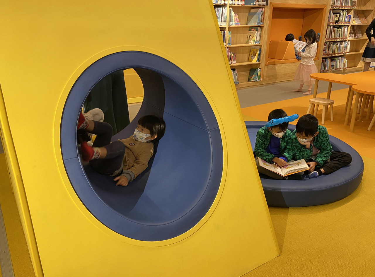 此外也規劃嬰兒車的放置處,體貼家長的需求,書櫃、書車更是依照兒童視角量身打造,並將幼兒書、繪本、故事書和青少年圖書,使用不同顏色的地毯區塊來分類,清晰的指引,方便不同年齡的讀者找書。