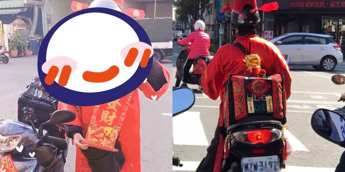 「他一下車我滿臉問號!」高雄一名女網友驚呼,最近訂外送,豈料送餐的外送員打扮特別喜氣,一邊撐開春聯,一邊祝賀恭喜發財,接著豪送糖果與紅包後,才遞上餐點給原PO,讓她不禁噴笑大讚!照片貼出後,掀起萬人朝聖,不少網友也在路邊看到外送員本尊,「他是三民區大紅人!」