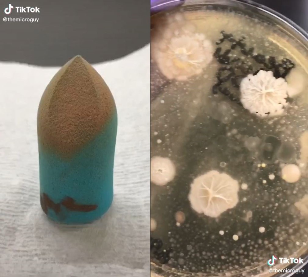 ▲男子將使用後未清潔粉底刷與美妝蛋進行細菌實驗,結果驚人。(圖/翻攝自TikTok/@themicroguy)
