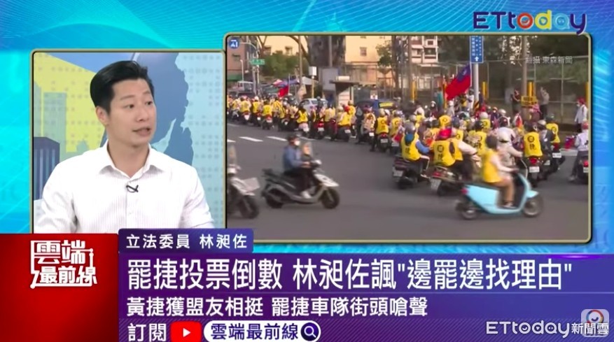 林昶佐進一步說,罷免團體因為理由不夠充分,就開始邊罷免邊找理由,「這當然不正當」,代表一開始就沒想清楚為什麼要罷免,「你就是不爽嘛!(前高雄市長)韓國瑜被看破手腳,不是因為黃捷翻白眼,就是因為韓國瑜(質詢)回答不出來!」