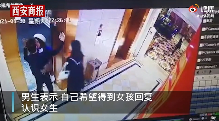 綜合陸媒報導,事發於30日深夜10點多,男子戴著口罩在等電梯,一名頭戴白色帽子的妹子突然向他走過去,並摘下他的口罩仔細一看,下秒竟強行環抱他,還把他壓到監視器死角猛親,突如其來的舉動嚇得他高舉雙手,好證明自己的清白。