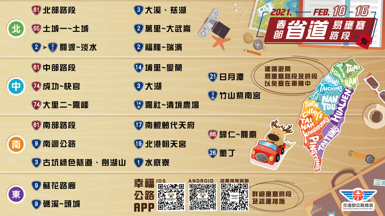 ▲春節連假省道易壅塞路段及時程表。(圖/公路總局提供)