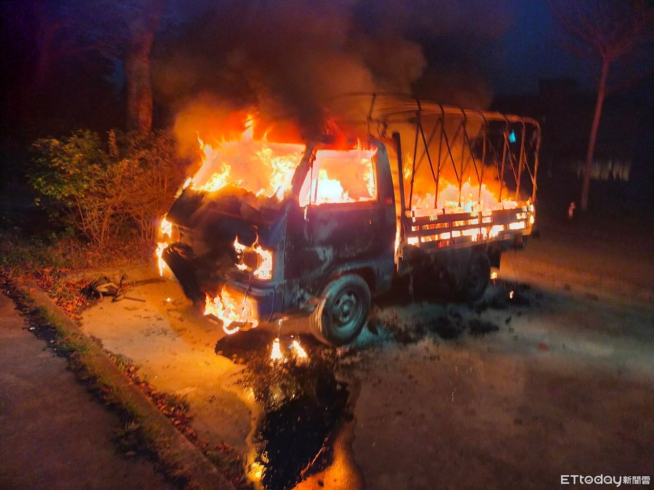 苗栗育達科技大學旁停車場,3日傍晚發生火燒車意外,1輛小貨車突然竄出火舌,不到幾分鐘時間燒成一團火球,消防人員立即前往灌救,不到5分鐘就將火勢控制住,但貨車已經燒成廢鐵,詳細起火原因,還在釐清中。