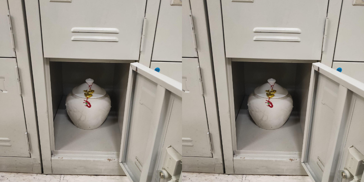 照片可見,原PO的櫃子位在正下方,白色瓷器上還掛著一串元寶與招財魚的吊飾,造型宛如是骨灰罈,確實第一眼莊嚴景象,會讓人產生誤會,原PO彷彿置身於靈骨塔搬,更不禁笑虧「我剛好車上有香...」