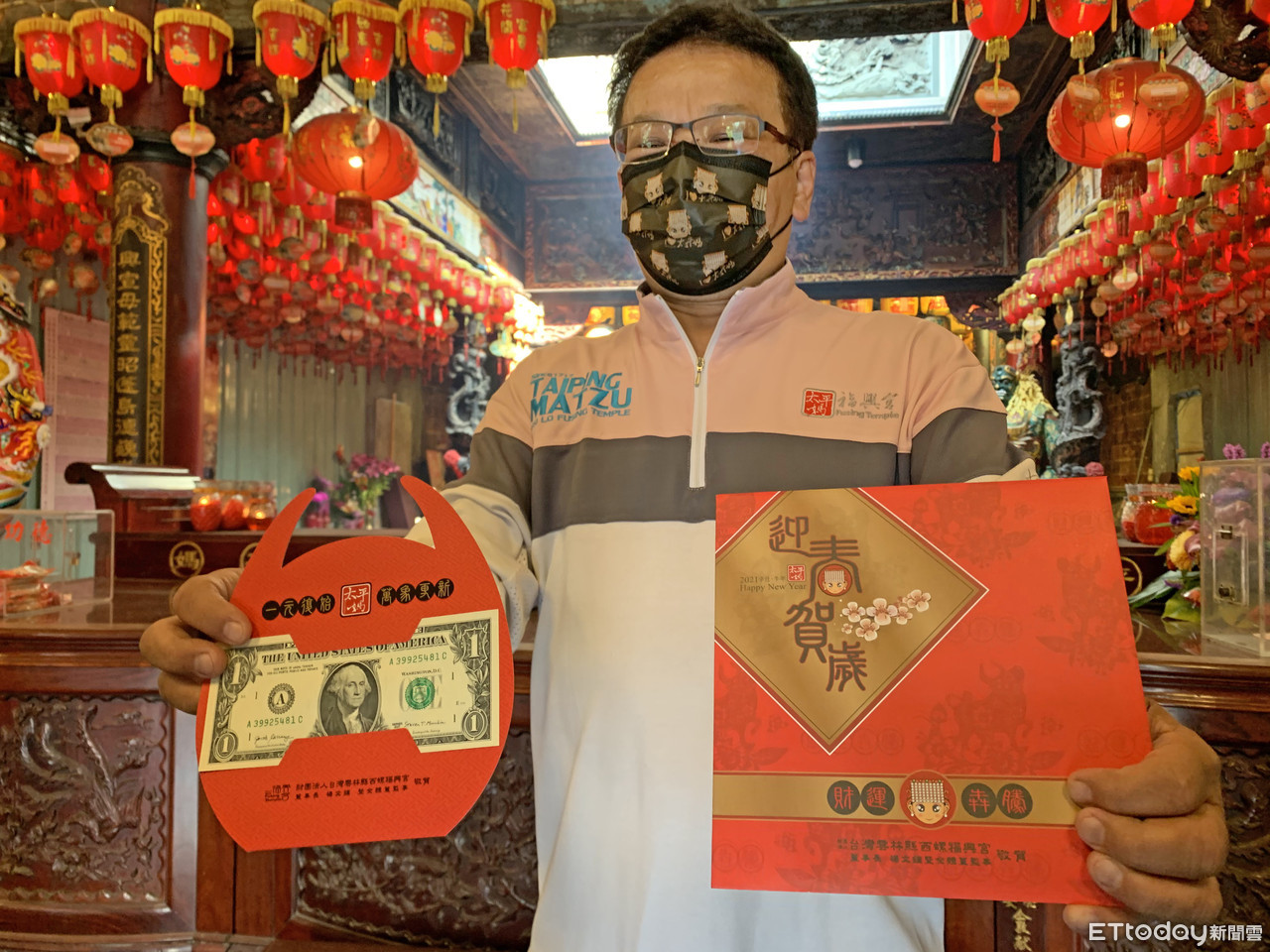▲今年2021年西螺福興宮準備8800個「財運犇騰」美金紅包,並配合防疫於廟前廣場發放。(圖/記者蔡佩旻攝)