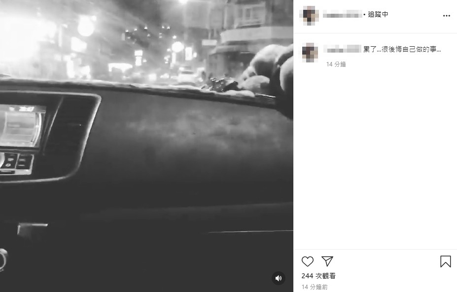稍早,男學生則發布一則時間僅3秒的黑白的影片透露心情,表示「累了,很後悔自己做的事。」而影片畫面雖然搖晃,但仍可以發現,他坐在汽車的副駕駛座上,拍攝沿途的景色。