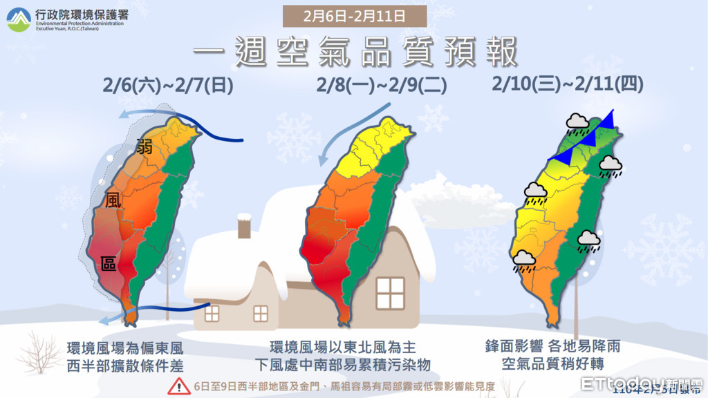 環保署也指出,6日至7日環境風場以偏東風為主,西半部擴散條件差,污染物較易累積,午後受光化作用影響,臭氧濃度易上升;8日至9日環境風場以東北風為主,下風處中南部地區須留意污染物累積情形;10日至11日鋒面通過及東北季風稍增強,全臺降雨機率提高,受降雨洗除作用影響,空氣品質將逐漸好轉。