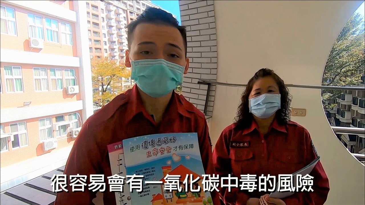 消防局為了讓民眾謹記「正確安裝熱水器」、「保持環境通風」2大關鍵,攜手婦宣大隊,拍攝3分鐘的詼諧劇,劇中是幾名婦人在屋內聊天,門窗緊閉,男屋主當時使用燃氣熱水器洗澡,所產生的一氧化碳逸散到屋內,有人嘔吐頭暈,有人心悸,更有人暈倒在沙發上。